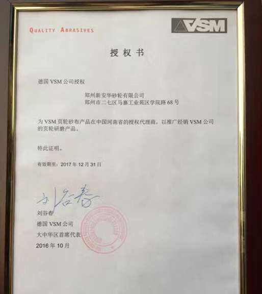 郑州新安华砂轮有限公司已经取得德国VSM公司砂布授权,公司将以最
